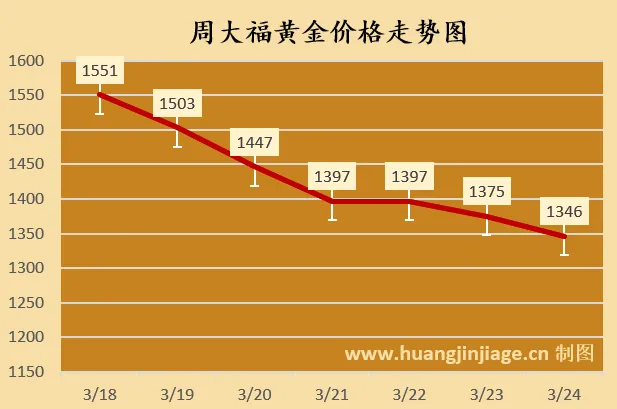 周大福 | 黄金价格 | 1346 | 跌29元 |