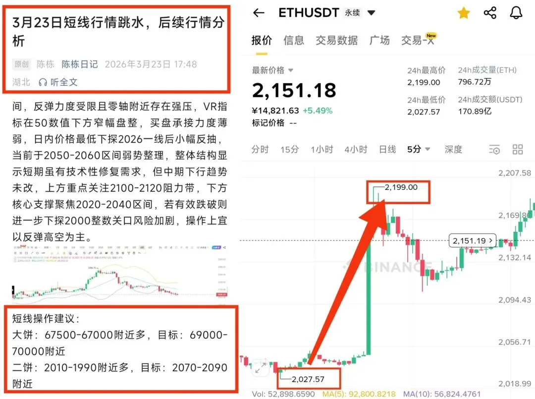 昨夜市场整体呈现强势上行态势,以太坊自2030区间开启反弹走势,最高触及2200整数关口,短线涨幅超170点,比特币则从67900位置强势上攻,最高冲高至71800一线,阶段涨幅接近3900点,市场多头动能表现强劲;此前晚盘给出的行情预判与实际走势高度契合,价格完成快速冲高后进入震荡整理阶段,短线波动空间相对有限,今日不再对昨日行情做过多复盘解读。