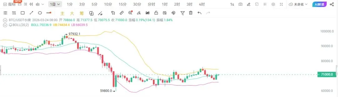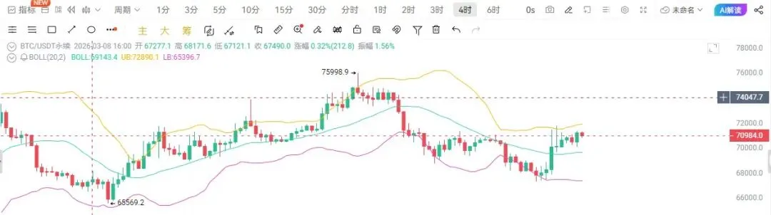 4小时级别MACD指标已形成明确金叉且持续上行,DIF与DEA双线同步抬升彰显短期多头动能逐步回暖,但日线级别MACD红柱呈现明显收缩态势,反弹势能显著衰减,大周期反弹强度仍需进一步验证,当前价格虽已站稳7日均线之上运行,不过30日均线与120日均线形成死叉压制,该区域构成多空博弈关键分界,加之行情此前快速冲高后于60日均线及布林带上轨承压回落,布林带整体趋于走平,短期均线交织向上,MACD双线延续上行但量能有所萎缩,KDJ指标于高位拐头存在回调风险,VR指标维持高位盘整,整体行情自67000支撑区域展开强势反抽后陷入多空反复拉锯的箱体震荡格局,73000一线仍是短期重要分水岭,只有有效突破并站稳该位置方能打开进一步上行空间,否则大概率延续区间震荡走势。