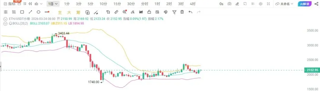 以太坊日线级别当前呈现弱势修复与中期空头压制并存的复杂格局,价格自阶段性低位展开技术性反抽后,虽短暂收复部分短期均线支撑,但始终受制于中期均线系统的持续下行压制,EMA30与EMA120形成的死叉区间构成核心空头防线,布林带整体维持走平缩口态势,价格在中轨附近反复震荡,MACD指标快慢线于零轴下方弱势走平,红柱动能持续收缩,反弹势能显著衰减,KDJ指标在低位金叉后上行乏力,VR指标于低位区间窄幅盘整,量能同步呈现缩量休整状态,反映出多头反攻力度不足,空头主导的中期趋势尚未被有效扭转,当前行情仍处于大级别下跌结构中的超跌修复阶段,2200-2250区间为关键压力带,2000-2050区间则为重要支撑区域,后续需重点观察价格能否放量突破中期均线压制并站稳关键压力位,方可确认反弹趋势的延续性,否则大概率延续区间震荡磨底走势。