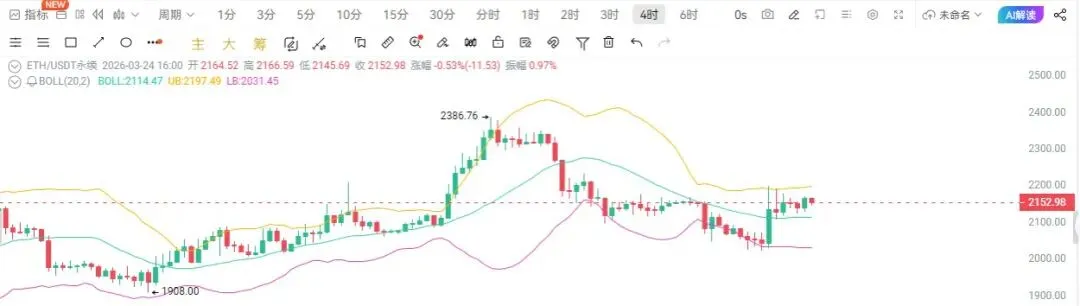 以太坊4小时级别呈现短期多头试探与中期压制并存的震荡格局,价格依托布林带中轨展开弱势反弹,MACD水下金叉后双线小幅抬升但红柱动能有限,KDJ低位拐头向上释放超跌修复信号,VR指标低位盘整显示买盘承接不足,短期均线交织走平,EMA30与EMA120死叉构成核心压力带,2100-2120区间为短线支撑,2200-2220区间为关键阻力,整体处于大级别下跌后的技术性修复阶段,量能持续萎缩制约反弹高度,需等待放量突破关键压力位方可确认趋势转强,否则大概率延续区间震荡走势 。