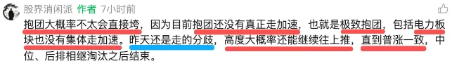 抱团大概率不太会直接垮,因为目前抱团还没有真正走加速,也就是极致抱团,包括电力板块也没有集体走加速。昨天还是走的分歧,高度大概率还能继续往上推,直到普涨一致,中位、后排相继淘汰之后结束。(来源于公众号文章评论区截图,仅供参考与交流,不构成任何投资建议,决策依据或交易引导。据此操作风险自负,股市有风险,投资需谨慎)