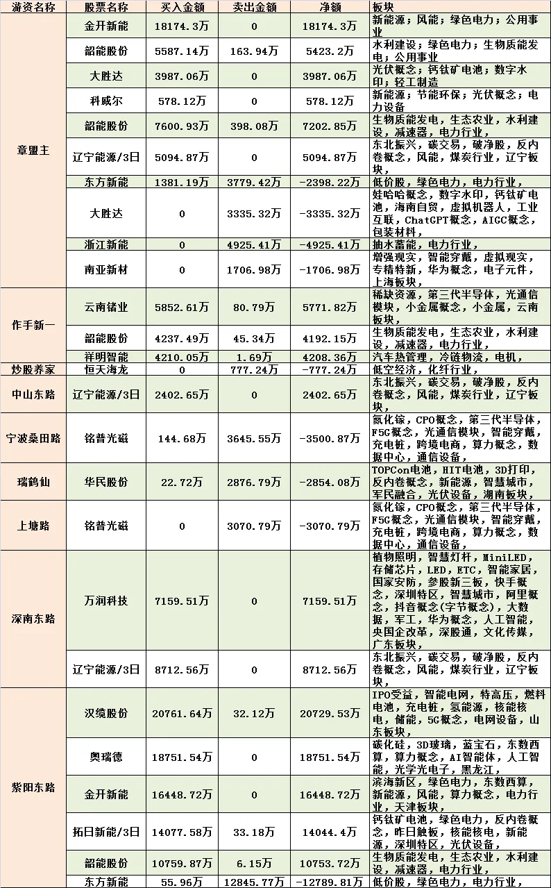 - 章盟主 + 紫阳东路 双主力合计超 3.46 亿重仓板块中军金开新能(当日涨幅 10.04% 涨停,绿电 / 算力配套电力龙头):章盟主通过国泰海通证券上海长宁区江苏路营业部买入18174.3 万元,无卖出操作,净额18174.3 万元;紫阳东路通过国泰海通证券武汉紫阳东路证券营业部买入16448.72 万元,无卖出操作,净额16448.72 万元。两大头部游资单日合计超 3.46 亿净买入,精准卡位算电协同核心受益标的,与个股涨停、板块批量上涨的走势完全共振。