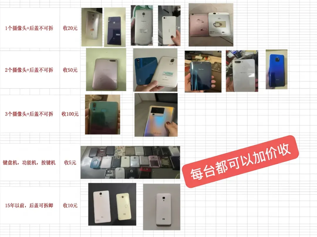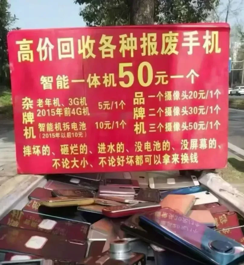 以前只能卖几块、十几块,换个洗脸盆现在能换包好烟、吃顿烧烤家里报废手机别扔,能到湖东镇富人街这里换钱有不开机的,进水的,砸烂的,退休的,车碾压等,全部都收,可以拿出来换钱了,随便一个都可以卖几十元,湖东本地人回收的手机只是拿来拆芯片零件使用不会倒卖资料,没那么多花里胡哨的高科技可以放心卖