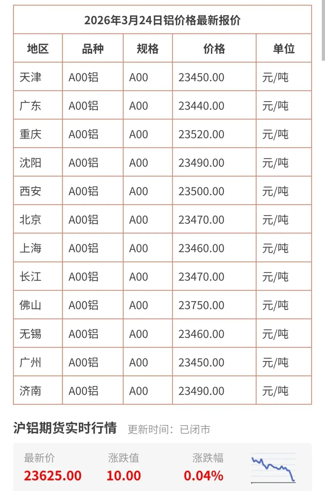 今天3月24日更新,今日铝价行情查询,包括天津、广州、上海、北京、无锡、广东、佛山等地区铝现货价格!长江有色铝锭最新价格是多少钱一公斤一览表
