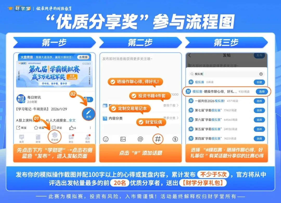 补充:如果你在【学财吧】话题模拟赛·晒操作聊心得,好礼等你下,累计发布5次以上学习分享,也可以获得排名奖的评奖资格,还能同时参与“优质分享奖”评选,赢取好礼!