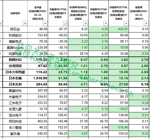 从市净率的角度,韩国KCC、日本京瓷的PB<1,此外,台湾同欣、ferrotec、Rogers、博敏电子(603936)、台湾九豪、日本丸和、富乐德(301297)低于PB中位数