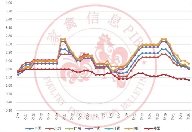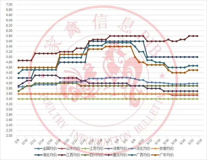 2026年2月8日-2026年3月24日主流地区白羽鸭毛鸭均价走势图
