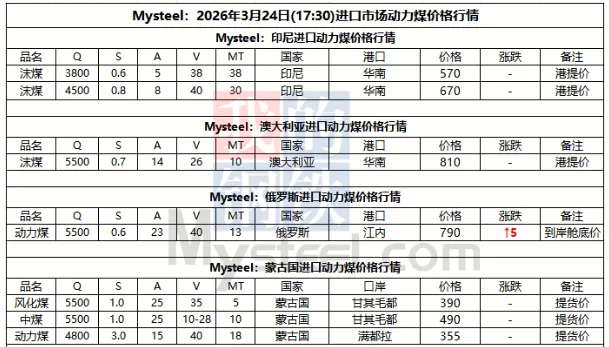 24日进口市场动力煤暂稳运行,在进口煤供应持续偏紧,海运费上涨致使内外贸煤价倒挂背景下,国内进口煤回船数量尚处低位运行。海外矿山报价方面,现阶段印尼Q3800巴拿马船FOB报价多在60-62美元/吨区间,Q5500澳煤巴拿马船FOB报价多在85-87美元/吨。国内市场中沿海电厂库存可用乐观,下游阶段性补库采购以远月交付的刚性需求为主,采购策略偏保守,对高价进口煤接受度低,导致即期货盘询盘积极性不足,市场交投氛围僵持,实际成交数量寥寥。后市需关注外矿报价变化及国内外煤炭海运费变化。