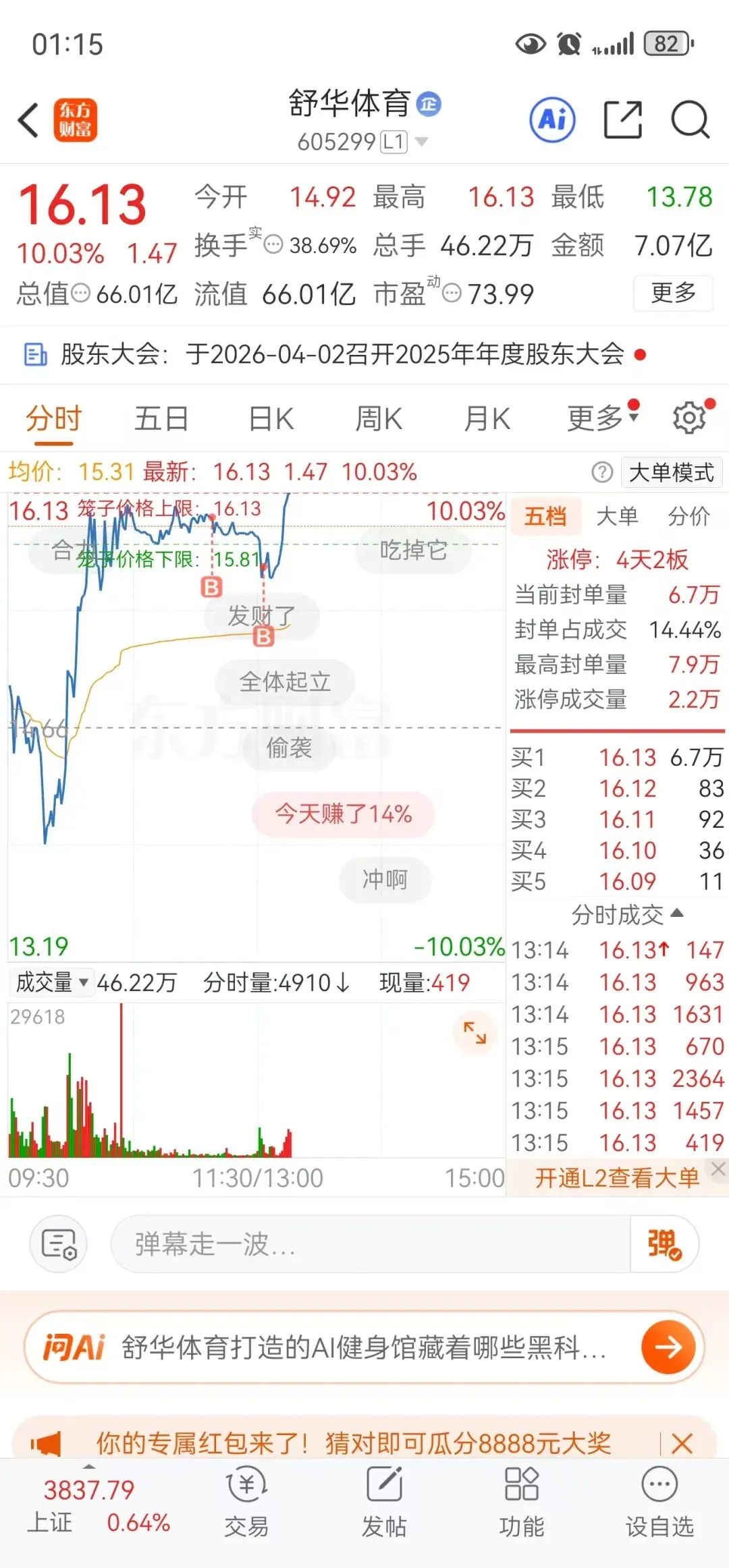 最近看到很多足球概念,体育概念异动表现,今日实盘分析提醒低吸接了点舒华体育
