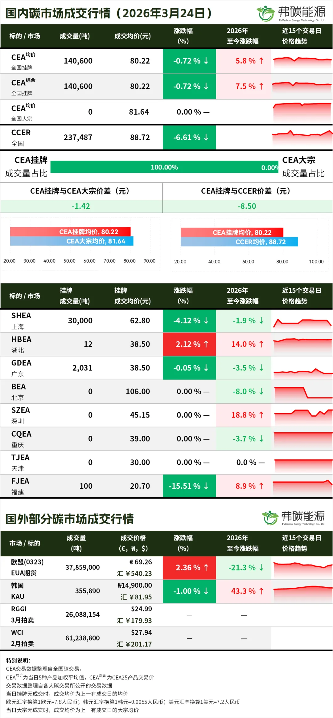 >碳市行情26.3.24 | CEA挂牌成交14万吨,成交均价下跌...