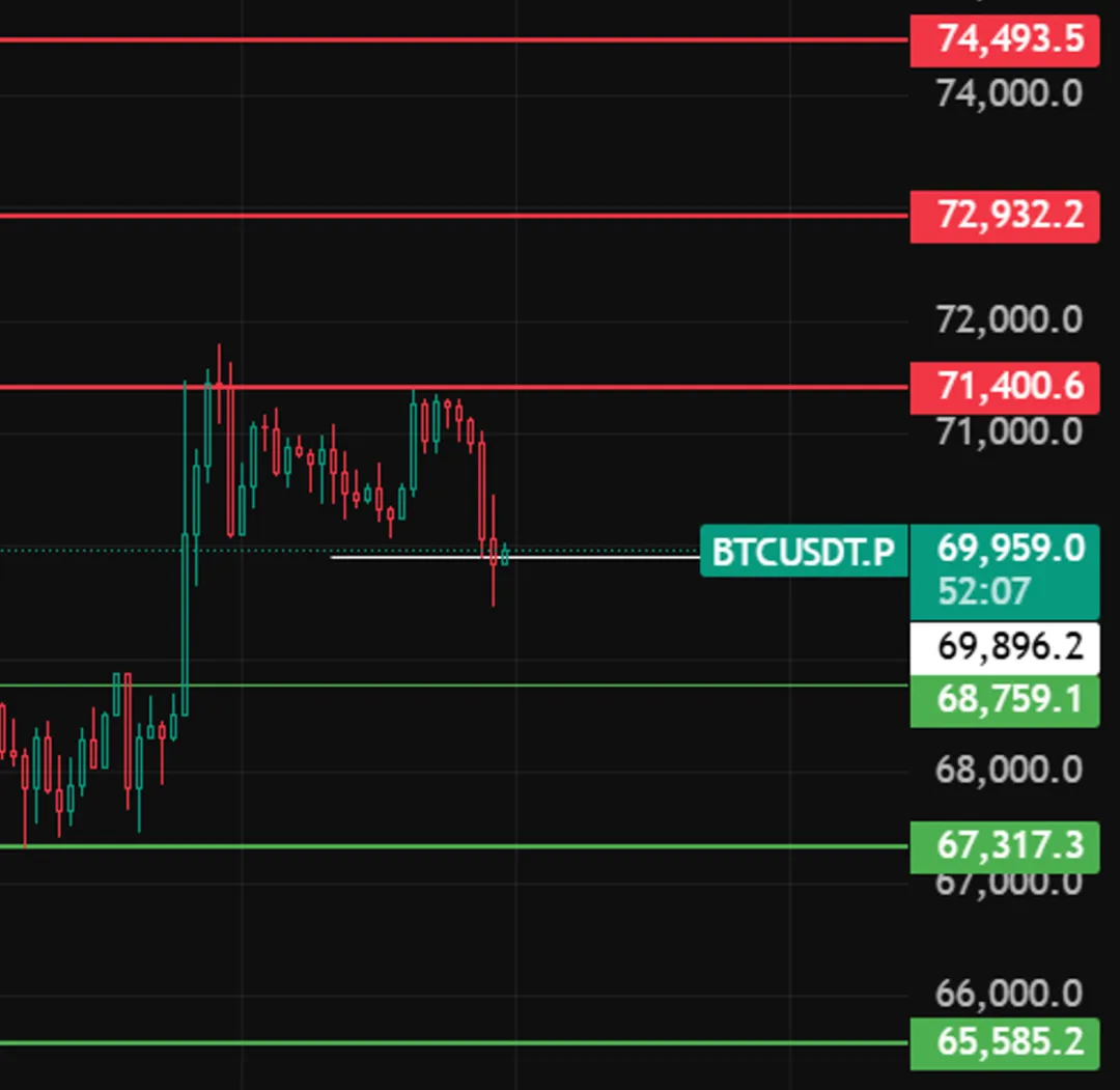 比特币晚上盯紧69900这个位置,若4小时级别跌破、收不回来,这波反弹就结束了,下方支撑看68560、67320、65580这几个点。