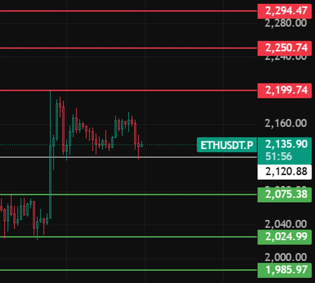 以太坊晚上看2120这个位置,4小时级别若跌破、收不回来,反弹就结束了,下方支撑留意2075、2025、1985。