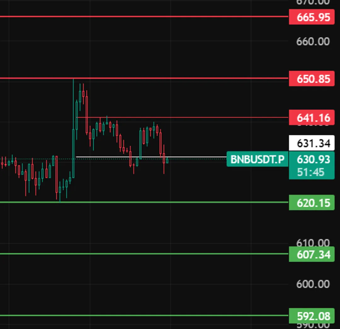 bnb晚上留意631这个位置,4小时级别若跌破、收不回来,反弹就结束了,下方支撑看620、607、592。