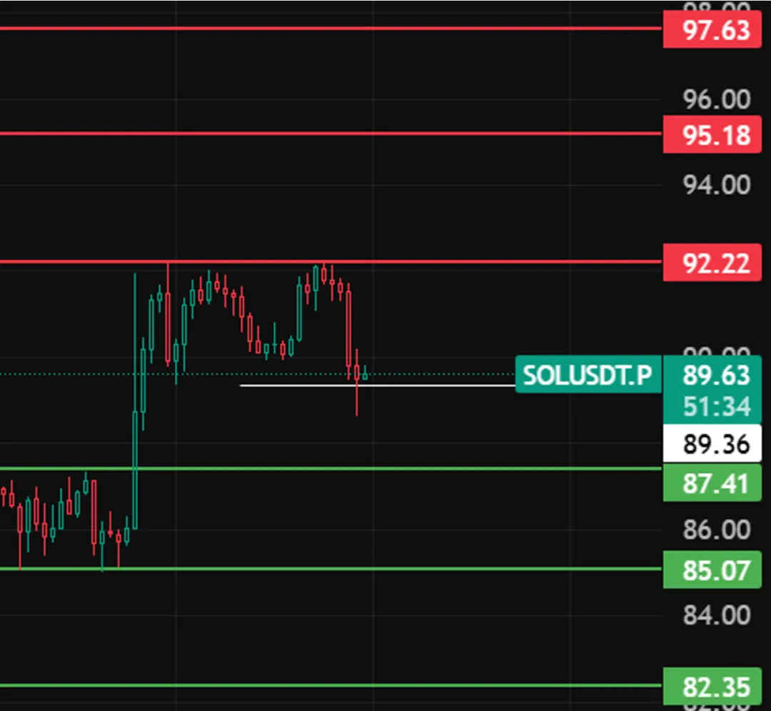 sol晚上看89这个位置,4小时级别若跌破、收不回来,反弹结束,下方支撑看87、85、82。