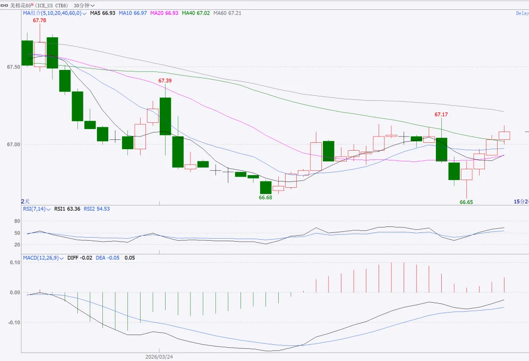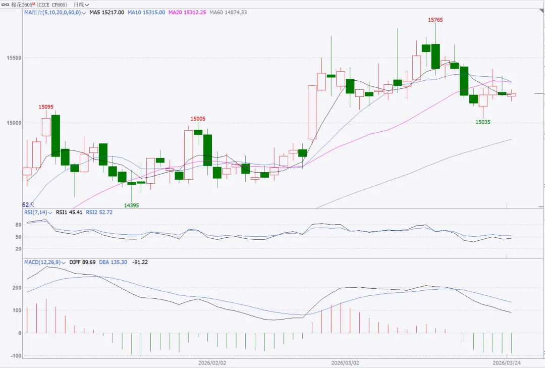 CF2605合约盘面显示:(1)3月24日,开盘价15235,最高价15360,最低15205,收盘价15215,跌幅0.62%。(2)收盘价跌破MA5(15217)和 MA10(15315),短期趋势转弱,进入回调阶段。2.ICE美棉主力合约30分钟周期走势图(如下):盘面显示:(1)3月23日,开盘价67.60,最高价67.97,最低66.93,收盘价67.23,跌幅0.16%,已持续3日下跌;(2)截止北京时间3月24日CTK6合约30分钟周期内,呈反弹趋势,23时收盘报67.07。1.现货与基差:CC Index 3128B 报16732元/吨(+140),现货强势反弹;CF2605基差1517元/吨(+205),期现价差走扩,现货对期货形成强支撑。2.供需格局:全球减产预期明确(2026/27 年度全球产量预计降 500 万包),新疆调减面积至3600万亩左右,中长期供应偏紧。30万吨滑准税配额落地,短期压制但消除不确定性,配额利空逐步消化。下游“金三银四” 旺季,订单充足,刚需支撑棉价。3.内外市场:3月24日美棉FCIndex M指数76.38美分/磅,与3月23日持平,3月23日ICE美棉CTK6合约报收67.18美分/磅(-0.13),外盘偏弱。3月24日内外棉价差3416元/吨(+107),进口利润扩大,外棉偏弱对内棉形成压制,但内棉基本面更强、走势相对独立。(1)量仓变化:3月24日收报15215元/吨(-0.43%),缩量减仓(成交减11.7万手至24.3 万手,持仓减0.62万手至57.2万手),资金参与度降温,短期获利回吐。(2)相对强弱指标:RSI(7)=44.30(-5.60)、RSI(14)=52.30(-4.98),回落至中性区间,无超卖信号。(3)MACD指标:零轴下方,绿柱与前一交易日相当,空头动能未增强,属技术性回调。(1)量仓变化:当日收报15355元/吨(-0.52%),缩量增仓(成交减5.34万手至12.1 万手,持仓增1.39万手至32.1万手),资金持续向远月移仓,远月预期仍偏强。(2)相对强弱指标:RSI(7)=49.26(-4.78)、RSI(14)=55.49(-2.48),仍处多头区间;(3)MACD指标:零轴之下,绿柱持平,修复节奏稳健。1.CF2605合约前20席位:当日多头392306手(-4936),空头448697手(-4484),多空比 0.87(-0.01),多空同步减仓,观望情绪浓,短期资金离场。2.CF2609合约前20席位:当日多头165691手(+8651),空头225033 手(+11662),多空比 0.60(持平),多空大幅增仓,分歧加大,远月博弈升温。1.郑棉VIX指数与波动率:3月24日,郑棉VIX指数=16.56(-0.66),低位运行,恐慌情绪弱。CF2605 合约平值(15200元/吨)隐含波动率=14.13(-0.69),CF2609 合约平值(15400元/吨)= 14.17(-0.19),波动率回落,期权定价理性。2.情绪指标:CF260合约成交量PCR=0.33(-0.01),持仓量PCR= 0.73(-0.01),均 < 1,看涨情绪占优,买方活跃。CF2609合约成交量PCR=0.53(持平)、持仓量PCR=1.05(持平),看涨为主、看跌增仓,多空趋于平衡。(五)ICE 美棉:偏弱运行,静待 USDA 报告1.美棉小幅走弱,3月23日ICE美棉主力收盘微跌至67.18美分/磅,走势弱于国内,且3月23日美国陆地棉现货平均报价续跌至63.93美分,外棉弱势未能给郑棉提供正向联动。3月31日 USDA 植棉意向面积报告临近,市场预期美棉面积缩减,对外棉有潜在支撑。2.内外价差扩大,3月24日,内外棉花价差走扩107元/吨,进口利润可观,外棉偏弱对内棉形成一定压制,但内棉现货走强、基差扩张,内棉主导自身走势。综合以上维度分析,极高的现货基差限制了期货价格的下跌空间,另主力合约缩量减仓,表明主动杀跌动能不足等因素支撑着棉价。但是,内外棉价差高位、远月合约空头增仓明显、技术形态偏弱、外盘美棉表现低迷等又是棉价的压制因素。因此,我们认为3月25日,棉价整体判断为“震荡偏强,区间运行”的走势。主力CF2605合约支撑位15100-15150,压力位15300-15350;远月CF2609合约支撑位15280-15330,压力位15450-15500。四、3月25日交易策略建议(短线为主,期权买方思路)1. CF2605(短线震荡):回调至15120-15150区间企稳做多,止损15080,目标15300-15350;反弹至15350-15360遇阻做空,止损15400,目标15220-15200。2.CF2609(逢低做多):15300-15330区间入场,止损15250,目标15450-15500。远月资金增仓、预期更强,偏多更优。1.CF2605:买入平值/浅虚值看涨期权(行权价 15200),隐含波动率 14.13适中,捕捉反弹;止损为标的跌破15100平仓。或者可构建卖宽跨式期权组合即卖出CF2605-C-15400+CF2605-P-15000。2.CF2609:买入浅虚值看涨期权(行权价15400-15600),因持仓PCR 接近1,隐波动率14.17,博弈远月补涨;或卖出浅虚值看跌期权,赚取时间价值。以上观点仅供参考,不作为市场交易依据,据此操作,风险自担!