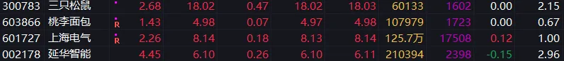 波段票:三只松鼠和桃李面包收涨,先等企稳。上海电气收下影线,跌多涨少,无力吐槽,耐心持有。延华智能收涨,拿好不动。