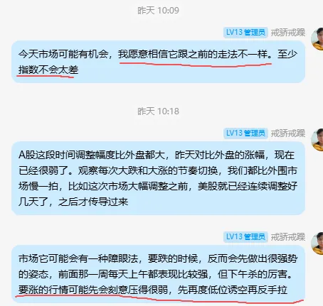 这就是A股的“障眼法”套路:要跌的时候,反而会先做出很强势的姿态。前面那一周,每天上午都表现比较强,但下午杀得厉害。要涨的时候,会先刻意压得很弱,先低位诱空,再反手拉起来。这个套路我每年遇到大行情都有体会。主力的目的很明确:反复收割散户,同时在最好的位置把散户甩下车。