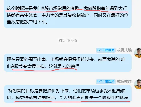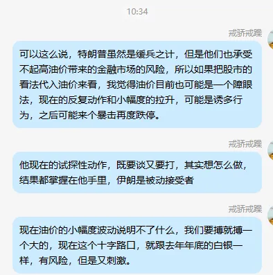 特朗普的目标是把油价打下来,他们的市场也承受不起高油价。既然股指今天是个阶段低点,那么把股市的看法代入油价,我觉得油价目前也可能是个障眼法。现在的反复和小幅拉升,可能是诱多,之后可能来个暴击再度跌停。今天的回光返照之后,下一个阶段还会砸下去才会进入相对平稳的水平。