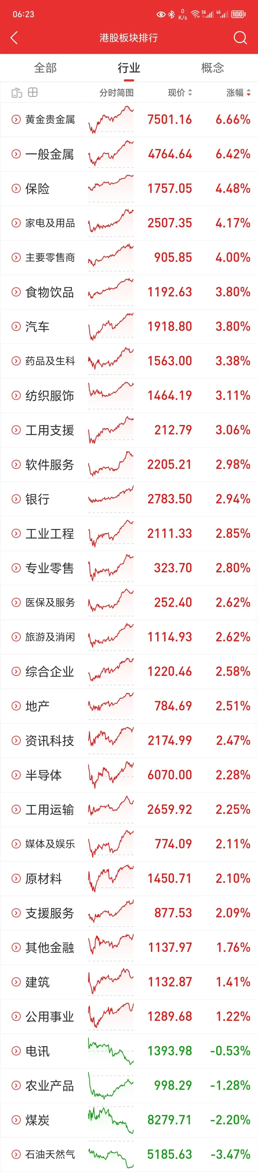 二、港股市场:同步走强,资源与金融领涨