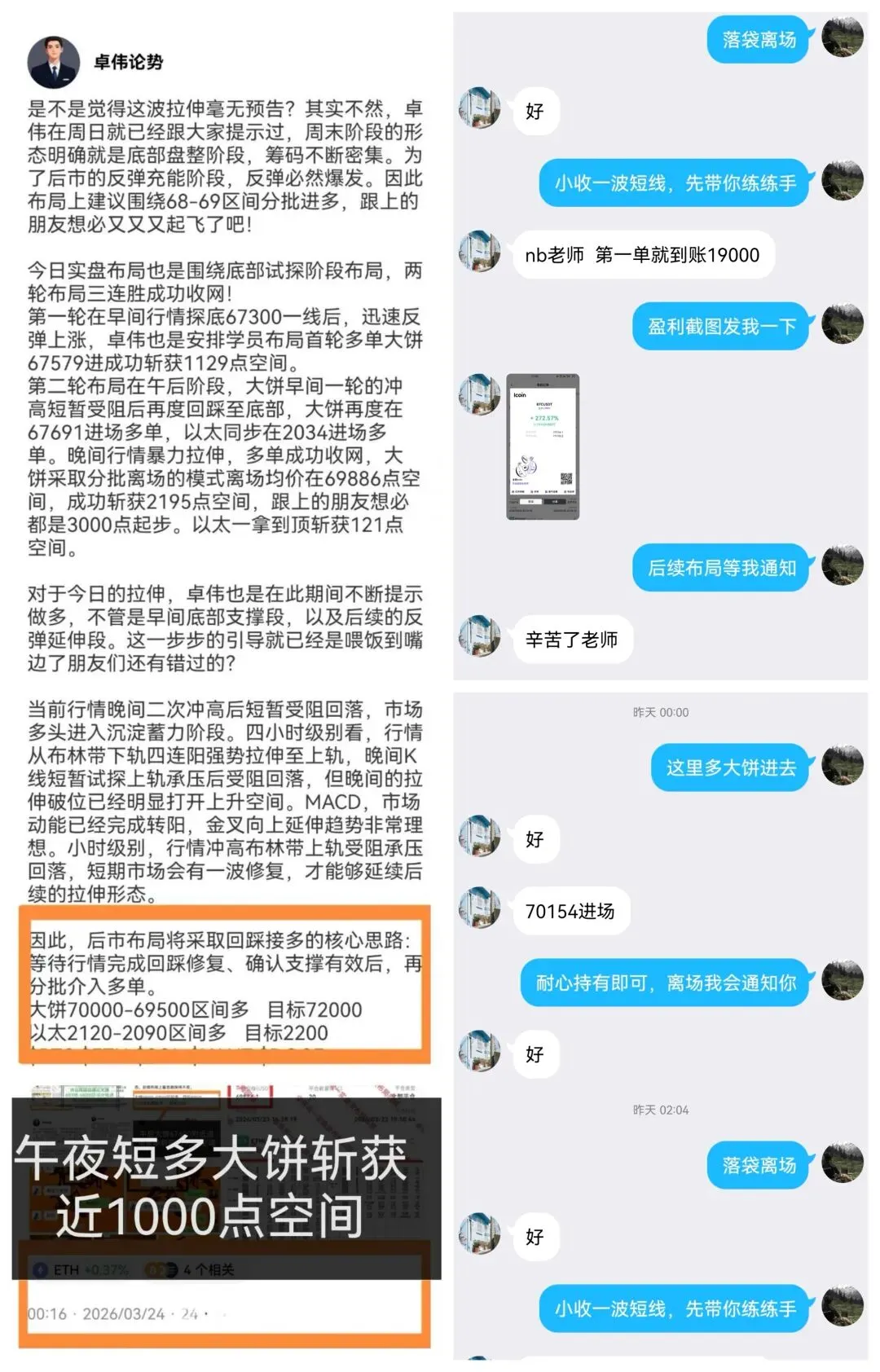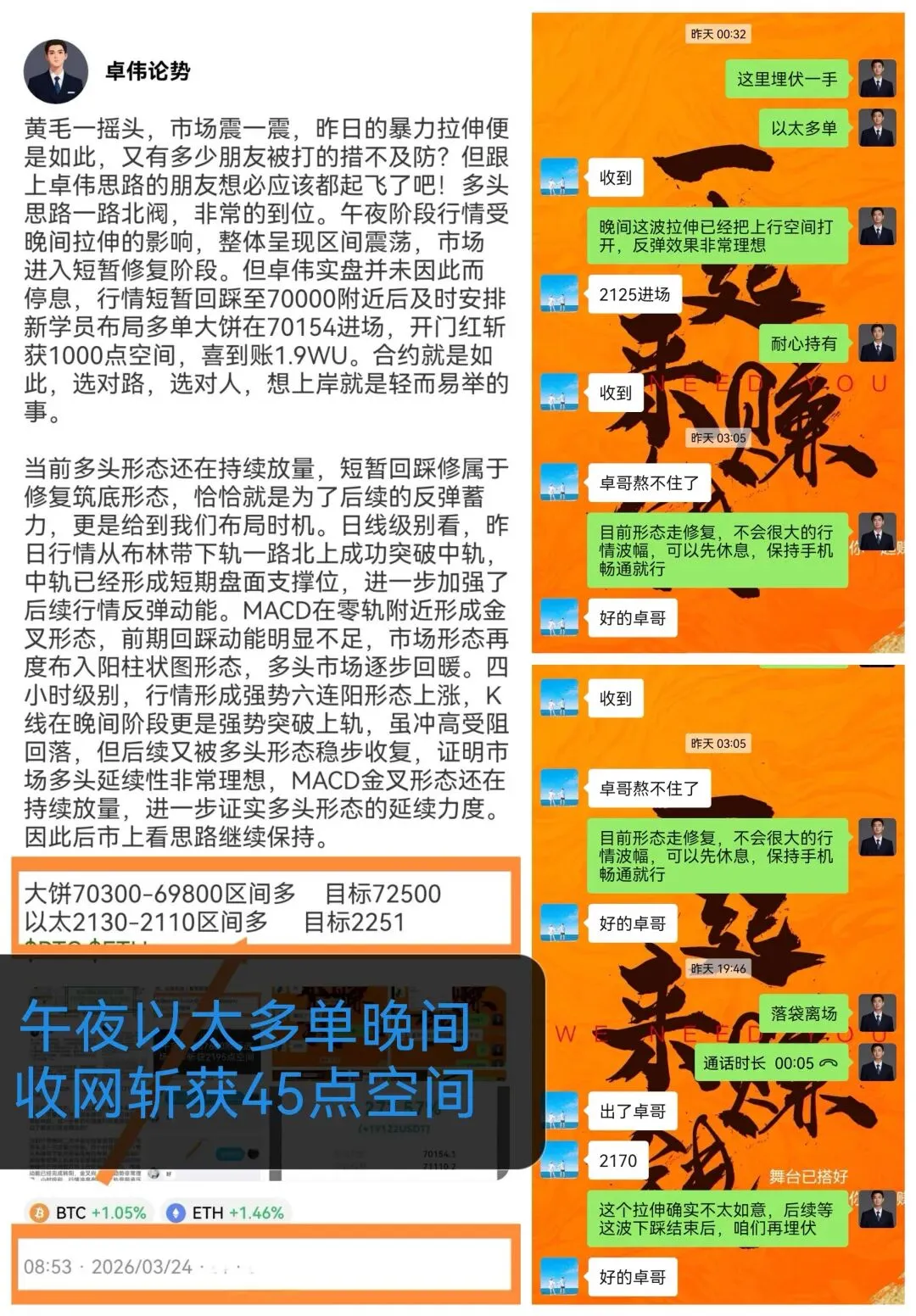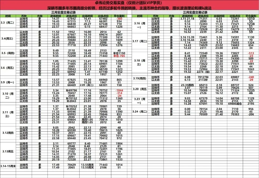 实盘今日布局相对低迷,午夜阶段布局大饼以太多单,大饼先是短线斩获1000点空间,以太等到晚间才收网,在2170附近收网,斩获50点空间。早间布局大饼多单在70600进场,补仓之后在晚间小损百点空间离场。交易本就有对错,错了咱们就调整,行情不会因人而异,风不往我们来,那我们就去追风。