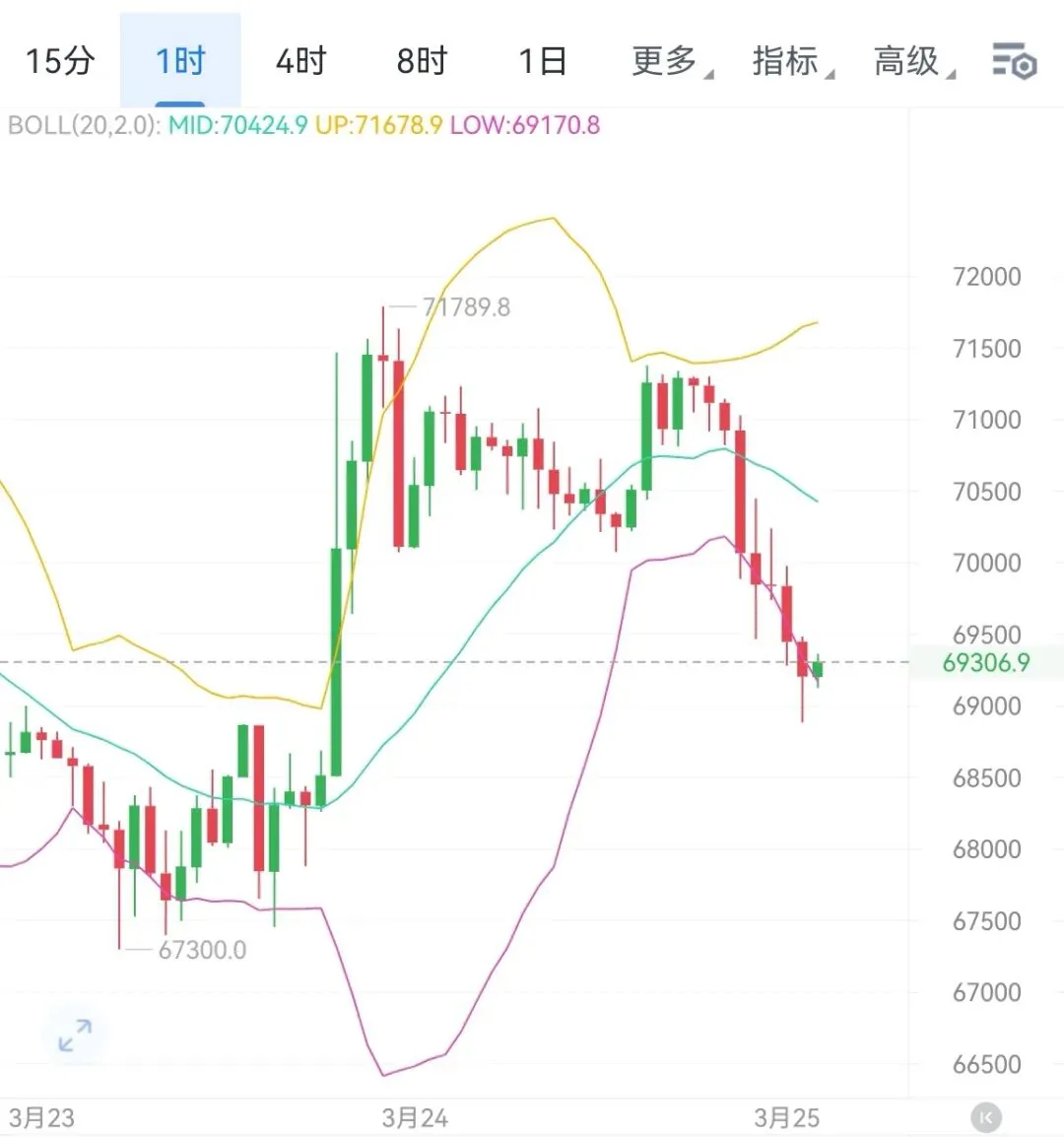 当前大饼行情底部69000试探,市场进入白热化阶段。四小时级别看,行情三连阴下行,强势突破布林带中轨,短期下行趋势已经打开,市场已经逐步转阴。MACD双轨拐头向下运行,阳柱状图被稳步下行运行,短期空头形态已经形成较强延续性。小时级别,行情形成强烈下行趋势,空头强势崛起,下行动能非常理想。