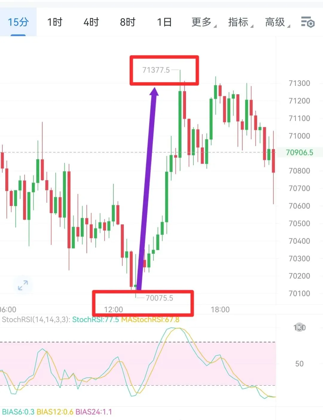 从大饼日线图来看,昨日走出一波探高回落的波动,触及71300前日高点附近后没有继续向上突破,比价承压回落,以回落代替回踩修正,空间走的较大,更考验实磐对压力及支撑的理解,跌破70000大关支撑后给到一定的延续,但并未有太多的后续,下去的有多快,上来的就有多迅速,日线收针,比价再次拉回中轨上方,虽然行情走的较慢,但目前已然有走出一波触底反弹形态,震荡上扬的格调,1小时线从boll上轨摔落至下轨,又企稳下轨,突破了中轨,有继续向上轨冲击的动能,早间操作可任意点位多,上看至前日高点71700附近,突破依旧看延续,上轨如若依旧不能有限冲破,我们临磐再行是否高空,操作一切以实磐为准。