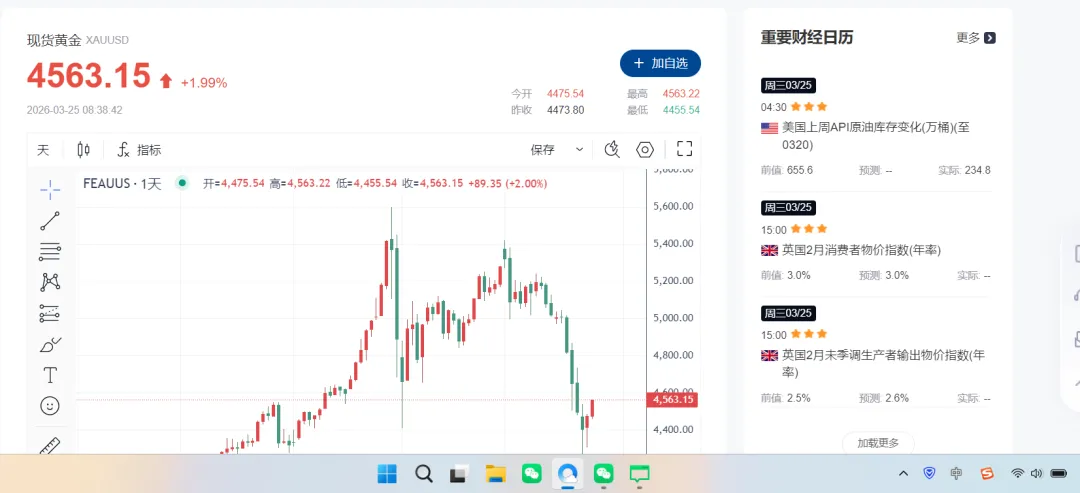 3月25日开盘,黄金、白银价格显著上涨,截至发稿,伦敦黄金现货价格涨幅达1.56%,COMEX黄金期货价格涨幅超3%。暂报4569美元/盎司,上方阻力位4580美元,若突破该压力线则有望再上4600美元/盎司。【今日(3月25日)重点关注财经数据与事件(北京时间)】① 08:30 澳大利亚2月未季调CPI