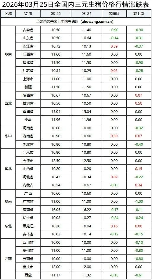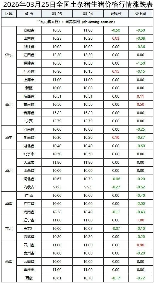 2026年03月25日全国生猪价格行情涨跌表
