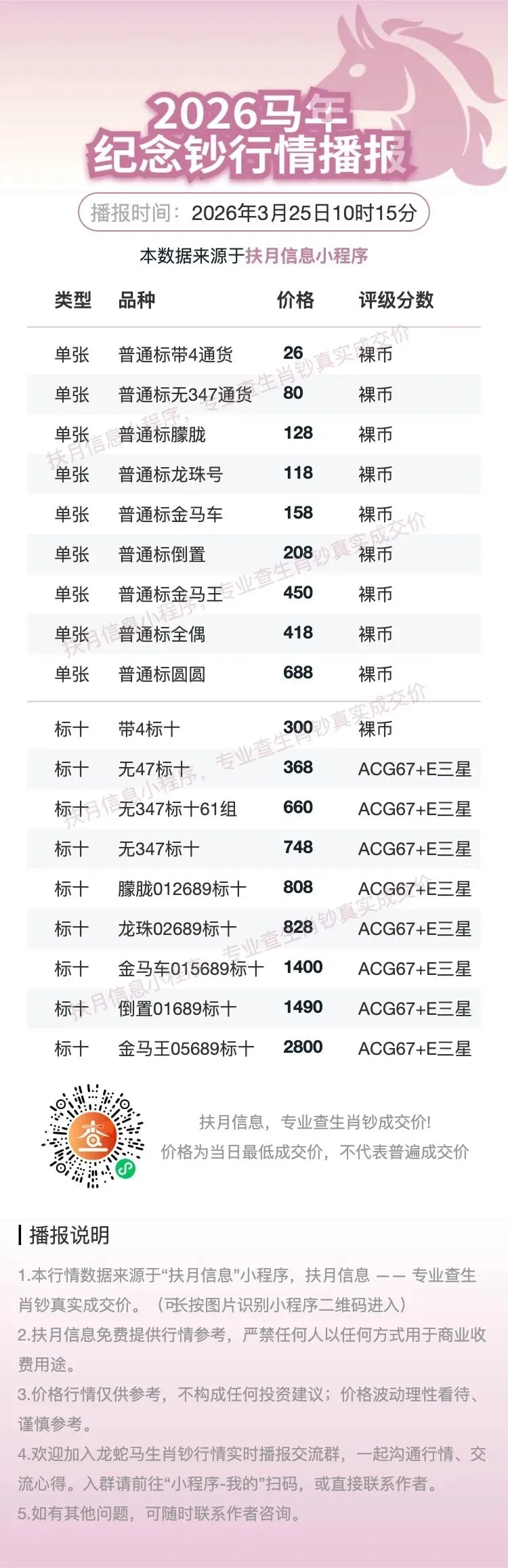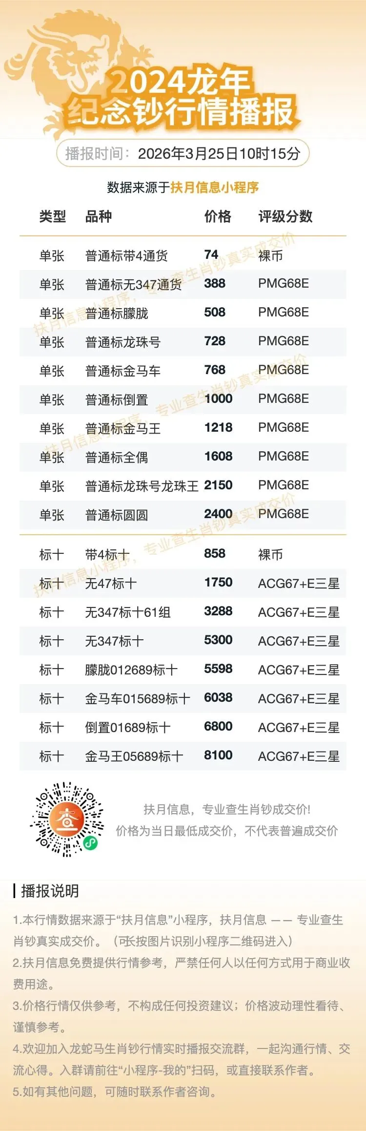 - 1.本行情数据均来源于 扶月信息咨询小程序,核心聚焦生肖钞真实成交数据查询。
