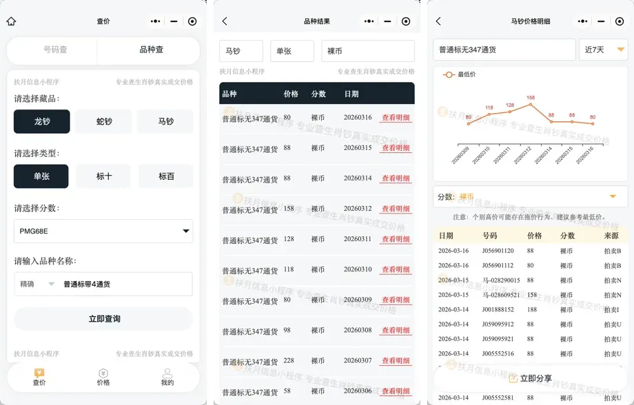 小程序支持龙钞、蛇钞、马钞全品类查询,可精准区分单张、标十、标百不同规格,还能筛选裸币、PMG68E、ACG67+E三星等不同评级分数价格,操作简单便捷,既可直接输入藏品号码精准查询,也能输入品种名称快速检索,帮你掌握市场真实行情,让交易、估价不再盲目。