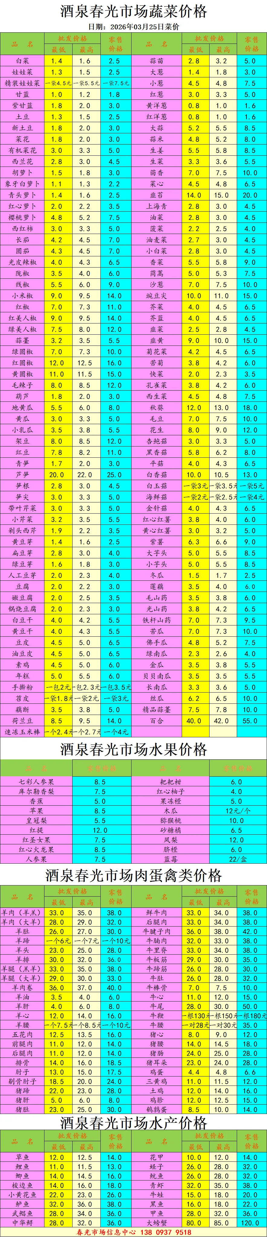 >【今日菜价】甘肃酒泉春光市场价格行情202 6年3月25日