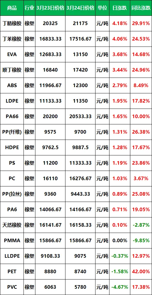 2026年3月24日大宗商品价格涨跌榜中橡塑板块环比上升的商品共14种,涨幅前3的商品分别为丁腈橡胶(4.18%)、丁苯橡胶(4.06%)、EVA(3.68%)。