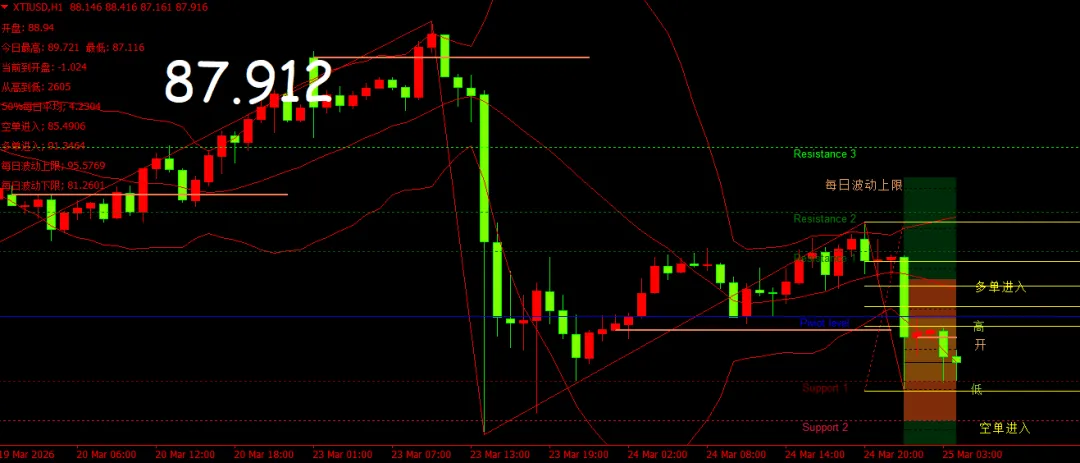 1关键形态提示:目前日线级别处于震荡上行通道中,但今日早盘跳空低开打破短期节奏,形成“跳空低开”形态,短期多空分歧加大;若能回补今日跳空缺口(89.5-90美元区间),则有望延续上行趋势;若跌破88美元强支撑,可能向86.34美元(3月24日低点)靠近。