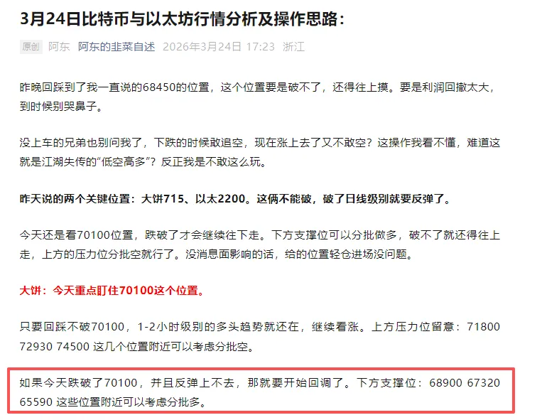 说实话昨晚这波走得太标准了。大饼夜间小级别没啥像样的反弹,直接精准插到了白天给的第一支撑位68900,然后现在小级别又开始反弹,又摸到了昨天白天的顶部压力区间。