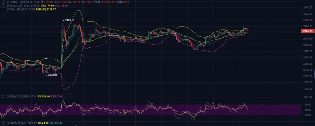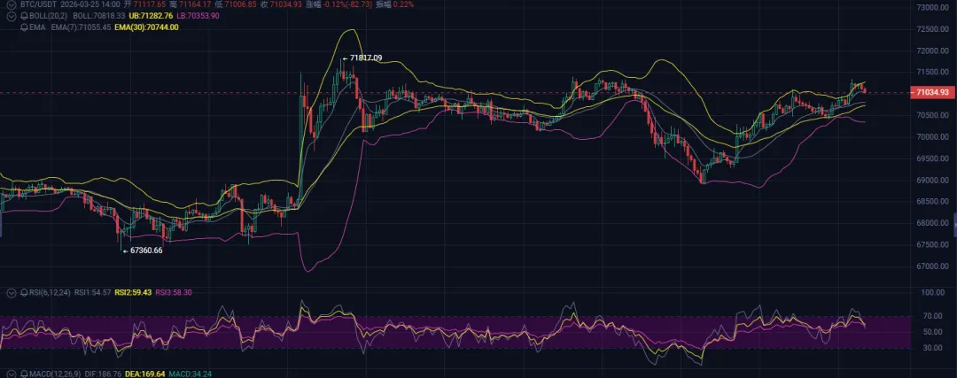 只要回踩不破,1-2小时级别的上涨趋势就没问题,继续往上看71400、72930、74500这几个压力位。如果今天跌破70100且反弹上不去,那1-2小时级别就要开始回调了,下方支撑看68900、67320、65590。
