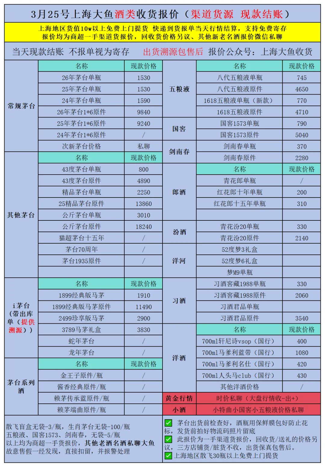 此报价为一手渠道货报价,回收货/送礼货价格另议,烟酒店回流货/三方店铺货/脏货不收,出货默认保真、永久溯源、包售后、故意售假扣货报警、不接任何国补货源