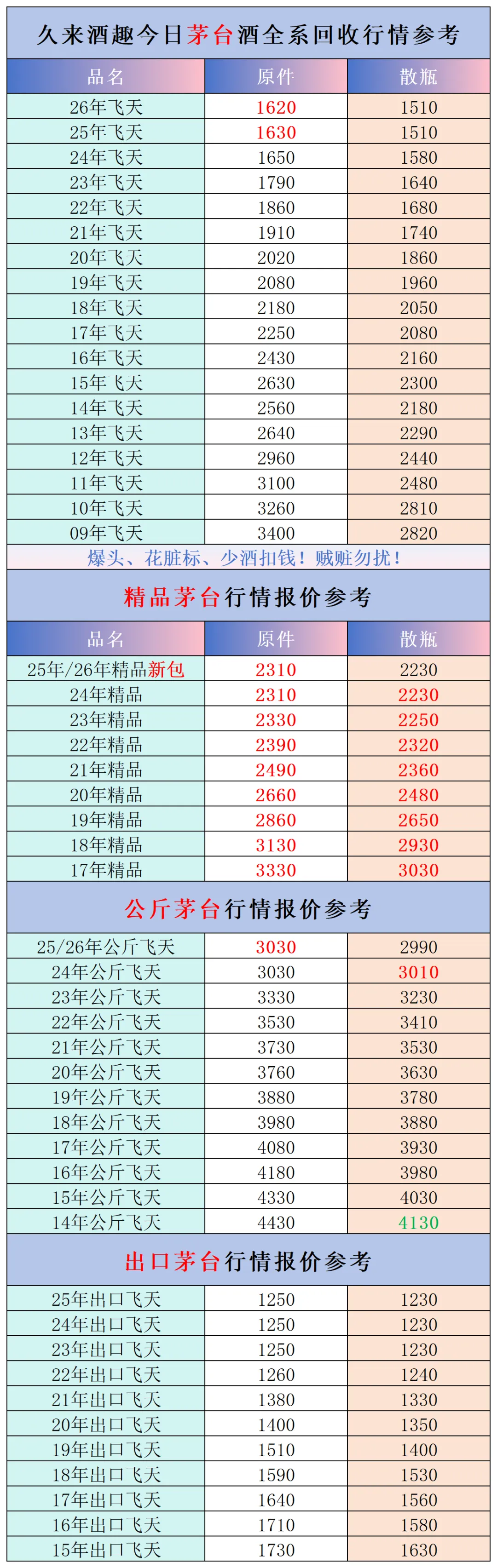 本公众号提供各种名酒回收行情报价,常规茅台、五粮液、洋河、剑南春、国缘等。所有报价根据市场买卖行情总结而来,每天更新最新报价!部分酒水每天涨跌幅较大,无法及时更新请谅解。本报价仅供参考,并非实际成交价格。感谢您的关注!我们会竭尽所能,提供更多更好的服务。