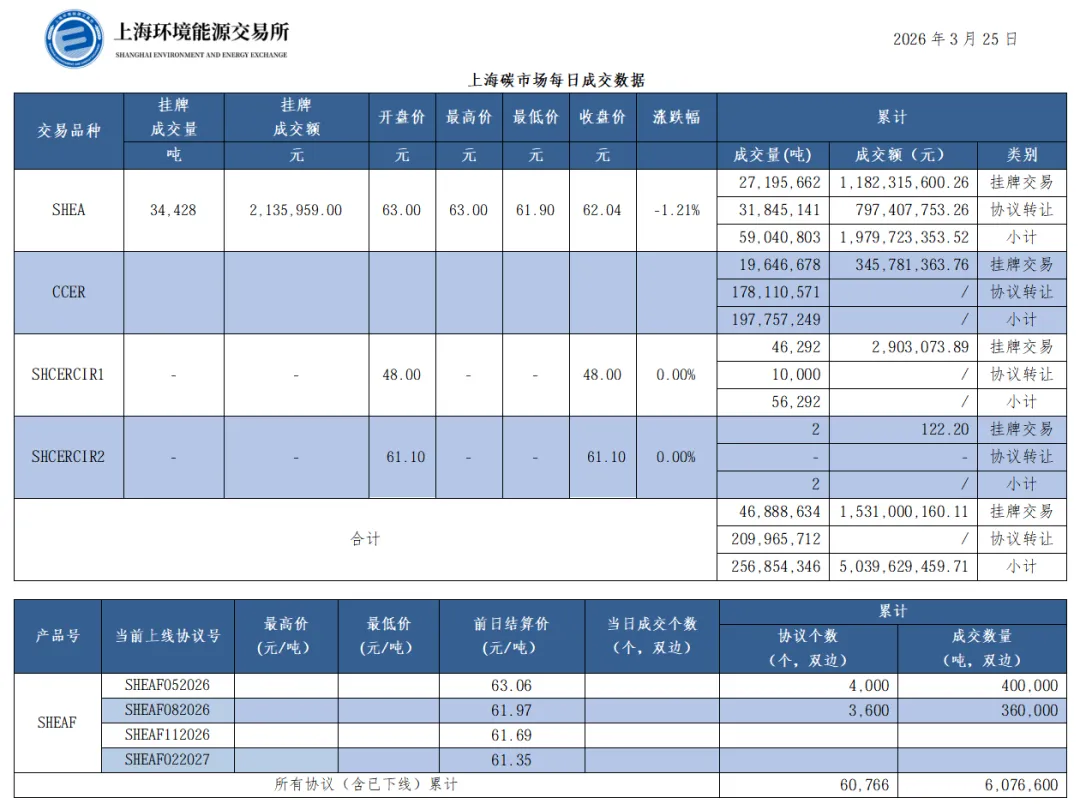 截至今日,上海碳市场所有现货品种累计成交量256,854,346吨,累计成交金额5,039,629,459.71元。其中,配额累计成交59,040,803吨,成交金额1,979,723,353.52元;CCER累计成交197,757,249吨;SHCERCIR1累计成交56,292吨;SHCERCIR2累计成交2吨。上海碳配额远期产品累计成交数量6,076,600吨。