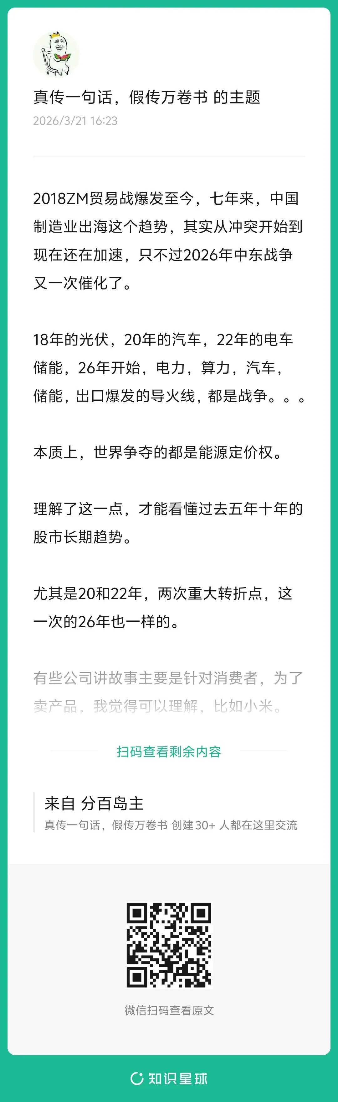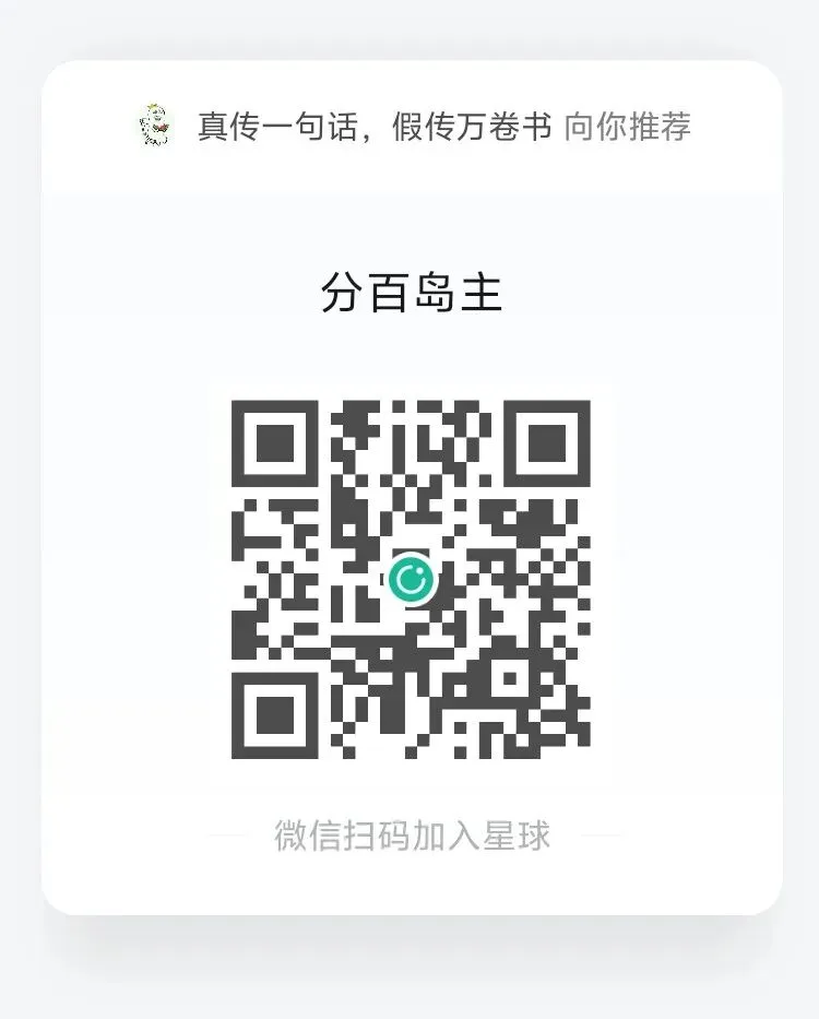 也欢迎您把我推荐给您的朋友圈,为确保您能收到每一篇分百好文,请点击右上角“分百岛主”加关注即可,您也可以设置加星标。如您还想看更多分百出品的独家内容,请扫描下面二维码加入分百知识星球;您也可搜索微信号:fbdz。我们的理想是:知识改变命运,投资实现自由。