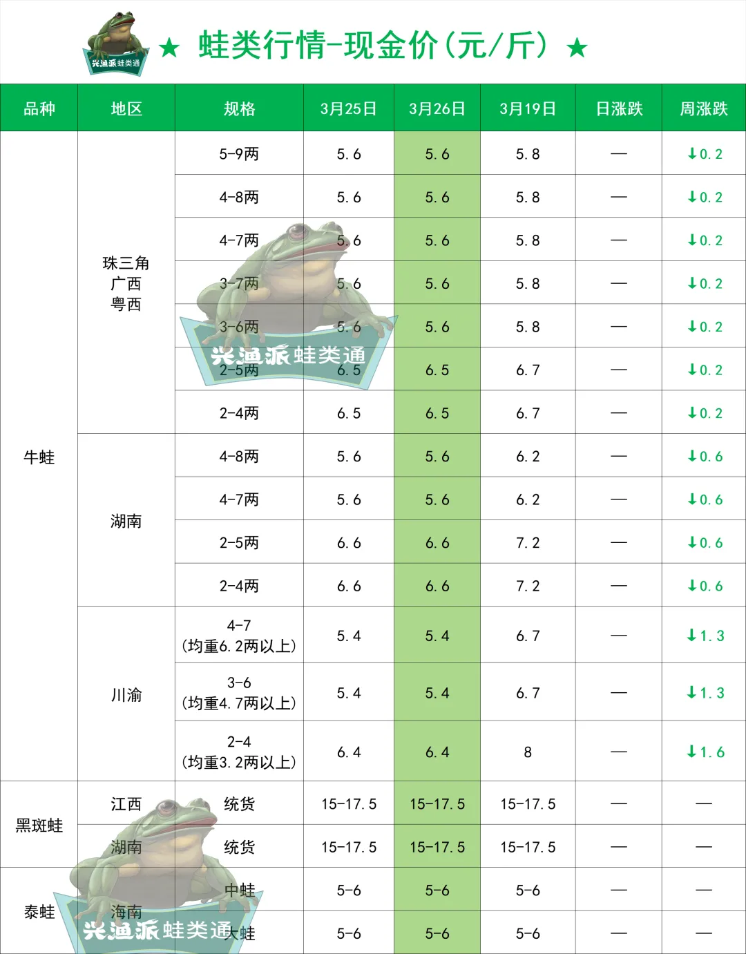 >3月26日全国牛蛙、黑斑蛙、泰蛙最新行情