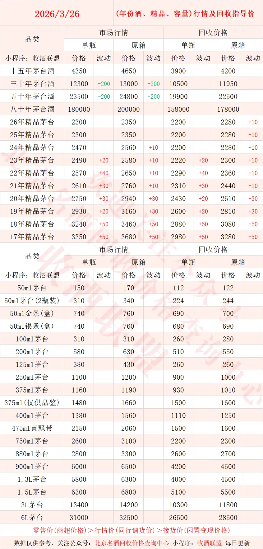 以下内容为,本公众号每日会及时更新的飞天茅台、生肖茅台、年份茅台,陈年茅台及不同毫升容量茅台的市场行情和回收报价;还包含五粮液、汾酒、剑南春、泸州老窖等国产名酒的行情及回收价,法国拉菲、木桐、玛歌等名庄红酒的回收报价,轩尼诗、马爹利、人头马等世界知名洋酒威士忌的回收参考价,每日整理不易,请点击关注支持。▪畅销类茅台行情及接货参考价▪