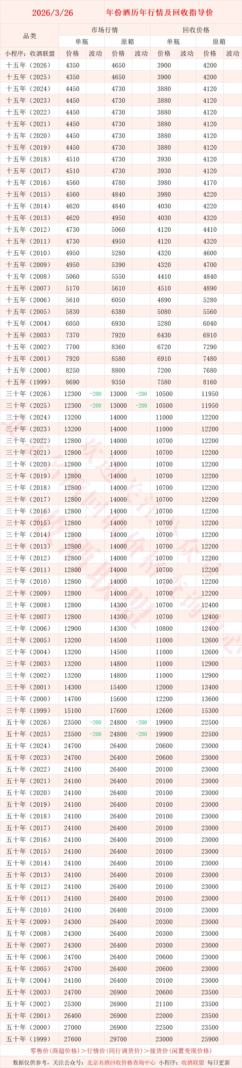 北京名酒回收价格查询中心,联系电话15652897909【同微】,专注于名酒回收行业的综合服务平台!是北京市价格认证中心、天津市价格认证中心的特聘专家,从业多年积累了各种名酒真伪鉴别经验,拥有多名品酒师、鉴定专家!累计服务数十家各省市价格认证评估,旗下小程序 “收酒联盟”,提供一键查酒价,不仅能一键查询各种名酒的价格,而且每日都会及时更新,保证你看到的都是新的准确行情。直接面向大众提供老酒,红酒,洋酒等真伪鉴定回收变现服务,回收价格专业靠谱!经过十余年磨砺,在全国100余座城市、四千多家业务会员酌情提供上门回收,是名酒回收行业中的翘楚!