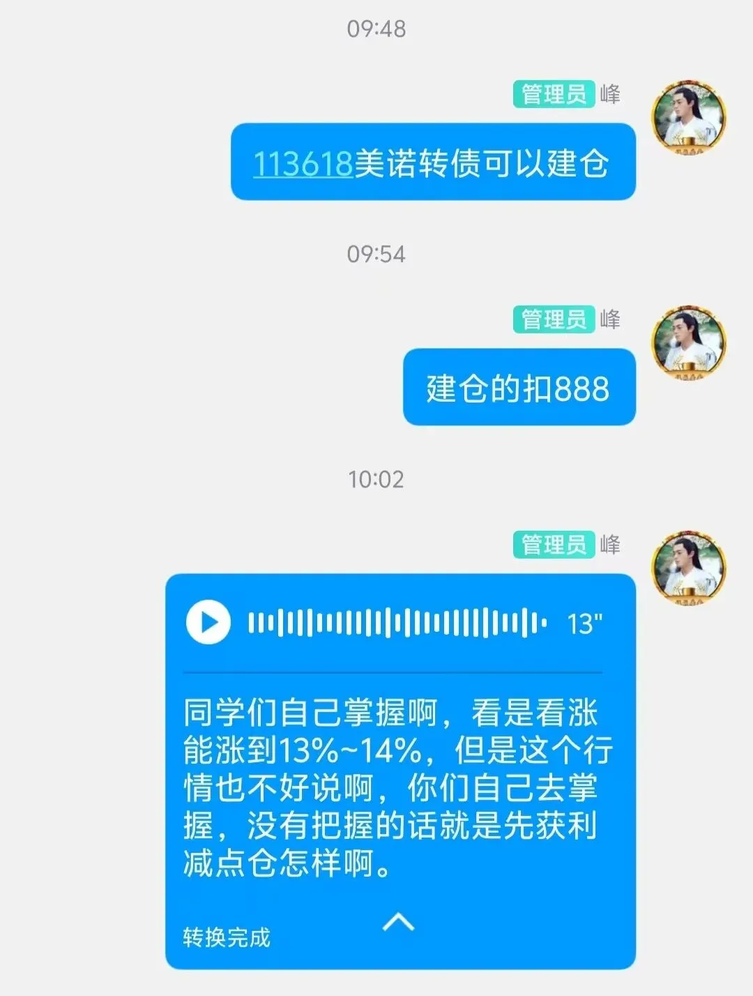 之后走势完全符合咱们的预判,价格涨到接近13%的时候,我先减了一半仓,同步发了信息,先把到手的利润稳稳揣进兜里。等价格冲到14%附近,咱们直接全部获利离场,里外里算下来,赚了不到6个点,不多,但足够稳当。