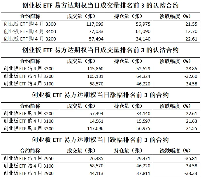 创业板ETF易方达期权总成交面额594.39亿元,减少29.73%,期现成交比为0.27,权利金成交额9.24亿元;期权总成交量1,833,834张,减少31.90%,其中认购期权成交量898,702张,认沽期权成交量935,132张,认沽认购成交比率为1.04(上一交易日认沽认购成交比率为1.20)。