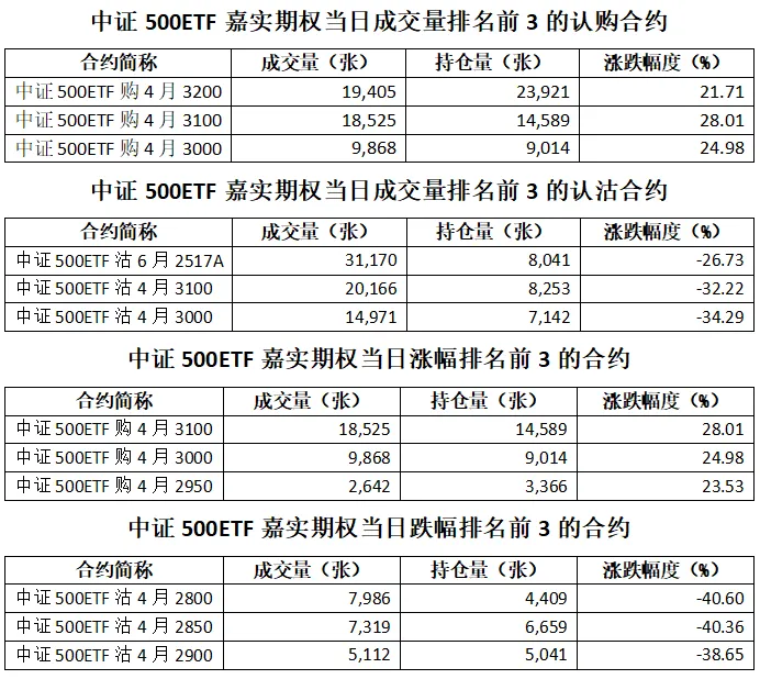 中证500ETF嘉实期权总成交面额125.94亿元,减少15.27%,期现成交比为0.03,权利金成交额2.53亿元;期权总成交量410,826张,减少15.93%,其中认购期权成交量189,319张,认沽期权成交量221,507张,认沽认购成交比率为1.17(上一交易日认沽认购成交比率为1.01)。