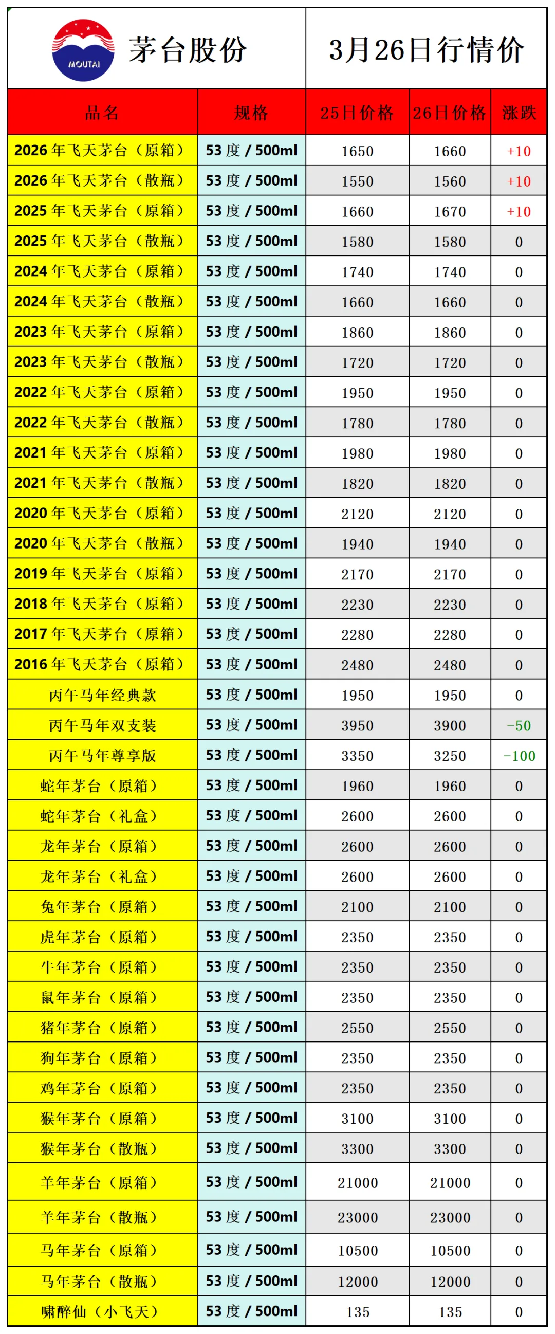 因各地行情有所不同,价格仅供参考!每天更新茅台价格,飞天茅台相关热点资讯,由于平台修改了推送规则,如若不想错过白酒市场行情报价参考, 请点击文章右下角的“在看”,推送会第一时间出现在订阅列表里,谢谢各位茅粉!