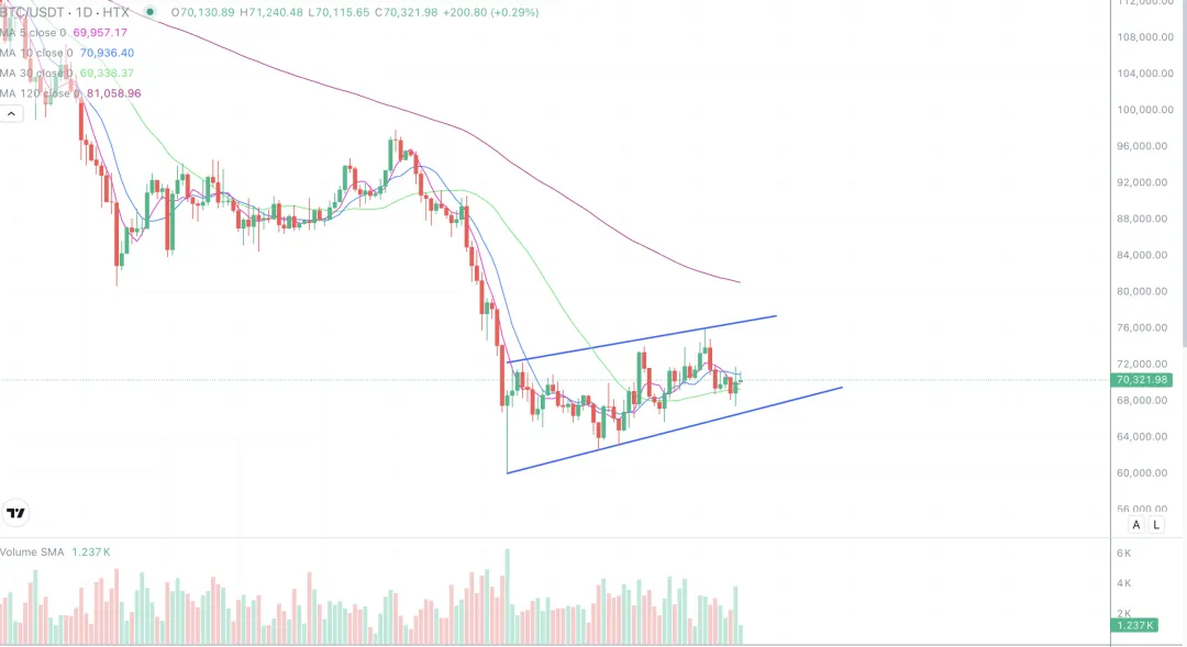 回到今天的盘面,比特币和我预计的应该是一样的,大概率会保持在6-7万这个核心区间震荡,现在也是月底了,最好是月线收一根阳线,这样就终止了比特币的月线五连阴,月线收个阳线看上去也没有那么糟糕,对下跌也起到了一个缓冲的作用。接下来我们就是耐心等待的时刻,等什么?等趋势的产生,然后顺势而为!