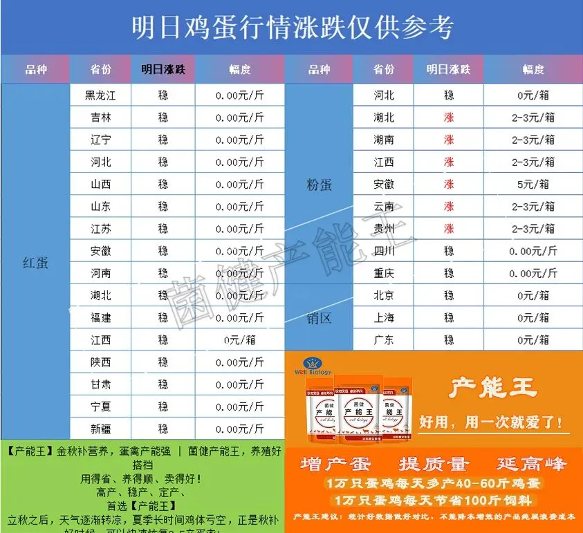 从明日行情来看,北京、山东红蛋产区将继续延续稳定走势,整体态势依旧偏强,市场存在小幅上涨的预期,不过当前市场上涨动力略显不足,即便有涨价空间,上涨过程也会较为费力,但可以确定的是,价格下行空间已完全封锁,绝不会出现回落情况。