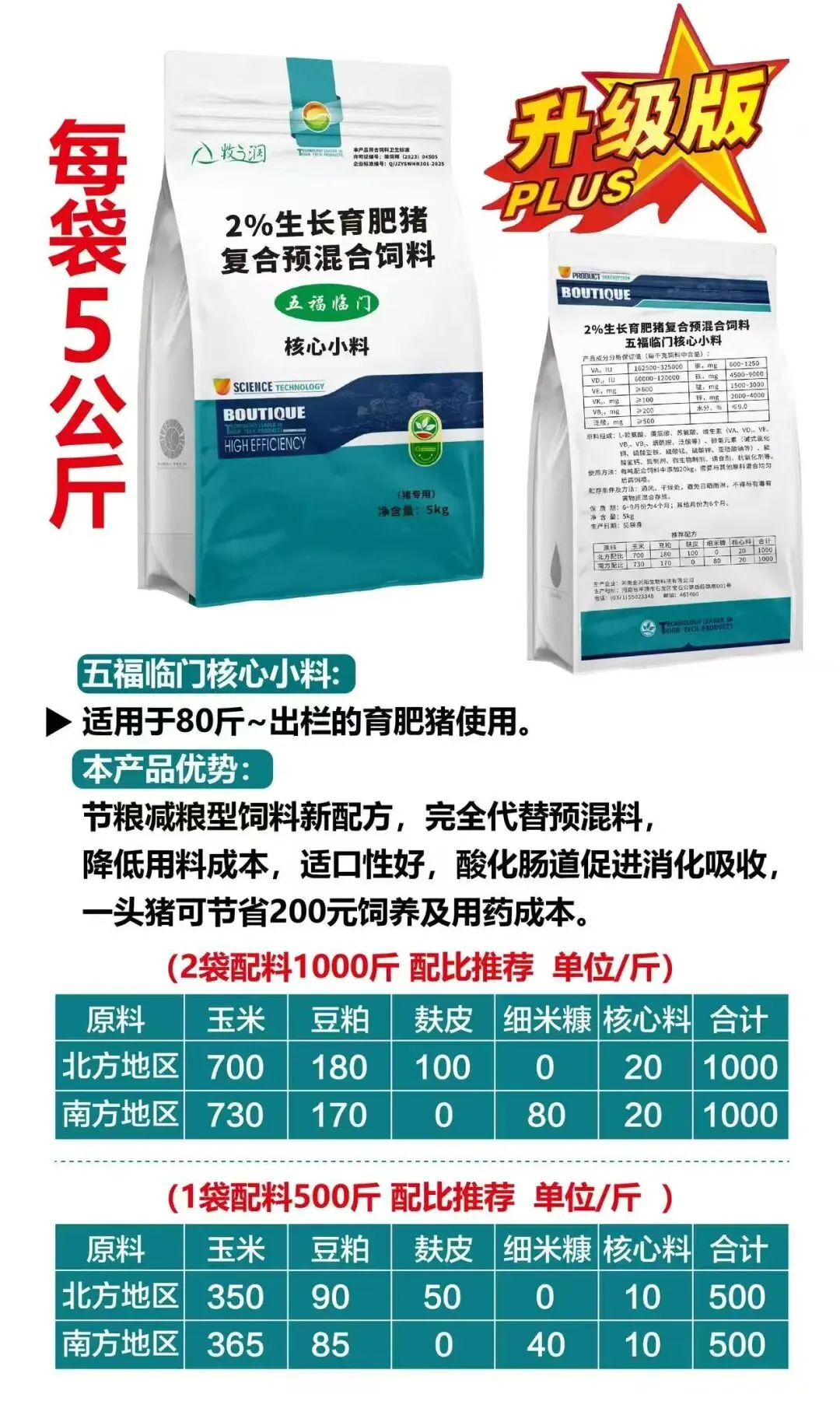 之所以叫核心料,就是它只保留了预混料中的核心成分,去除了石粉米糠等多余的载体,另外还可以抗病毒 促消化 补充营养 祛霉变 防小飞,能催肥,并且提前20天出栏!核心料的主要优势就是降低饲料成本,降低料肉比,多挣钱!从断奶到出栏养殖成本可控制在6元以内!1件10包,1包5公斤可配料500斤。1件多送2袋,5件多送1件!多买多送!